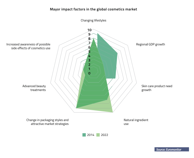 L’utilizzo di ingredienti naturali attivi in trattamenti di cosmetica avanzata è valutato uno dei fattori che più influenzeranno la crescita di un mercato trainato dallo skincare, mercato cosmetico globale valutato circa $ 430 miliardi nel 2022, con una crescita annua attesa intorno al 4.3% .